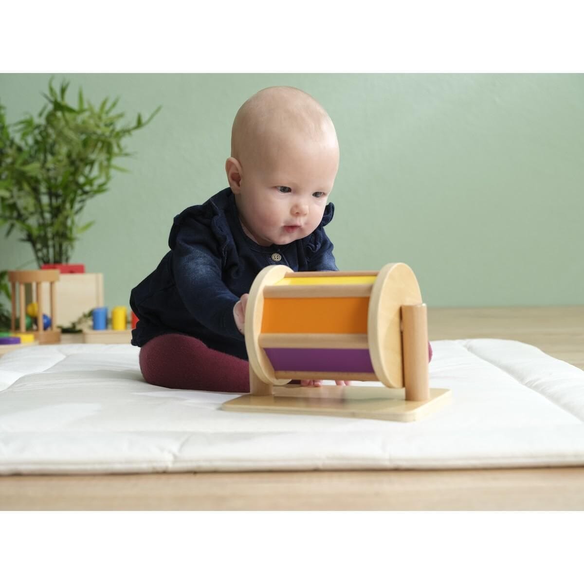 The movement of Spin the drum trains hand-eye coordination and control over wrist and arm muscles. Children experience how movement creates sound and develop sound awareness. By spinning repeatedly and discovering the effect, motor skills and visual perception are strengthened. This encourages experimentation and active discovery. 8 ¼” x 6” overall; 5” high. Ages 7-11 months.